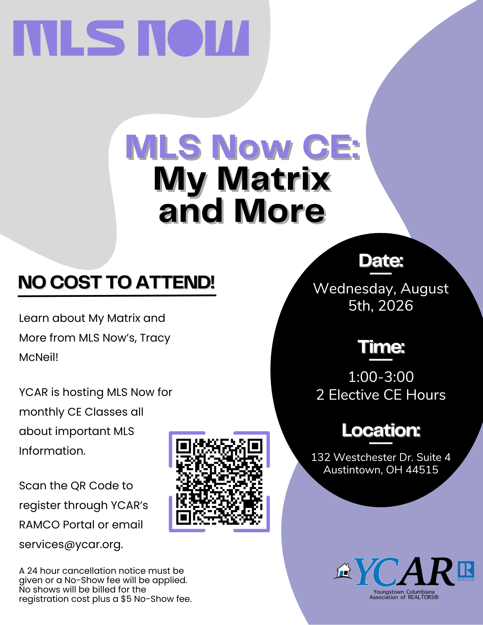 05 Aug August - My Matrix & More CE August - My Matrix & More CE Wednesday, August 5, 2026 (1:00 PM to 3:00 PM) 2 Education Credits YCAR Office, Austintown, Ohio Details You're Registered! DescriptionLocation YCAR Office - Conference Room YCAR Office (Conference Room)132 Westchester Dr. Suite 4Austintown, OH 44515 Map & Directions