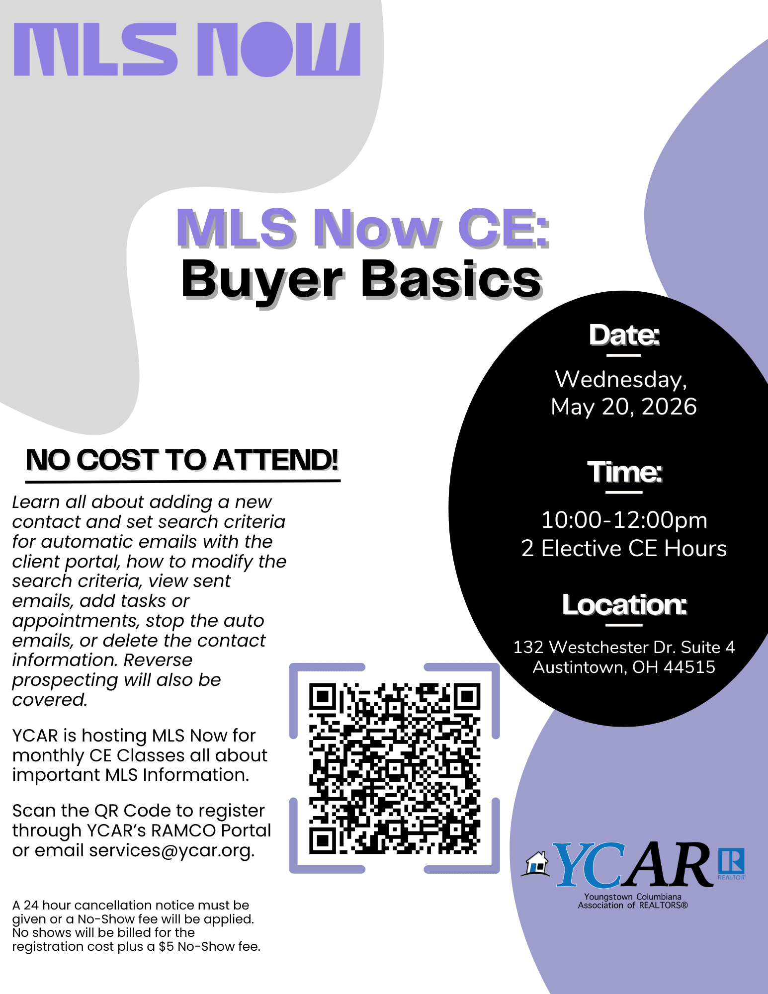 20 May May - Buyers Basics CE May - Buyers Basics CE Wednesday, May 20, 2026 (10:00 AM to 12:00 PM) 2 Education Credits YCAR Office, Austintown, Ohio Details You're Registered! DescriptionLocation YCAR Office - Conference Room YCAR Office (Conference Room)132 Westchester Dr. Suite 4Austintown, OH 44515 Map & Directions