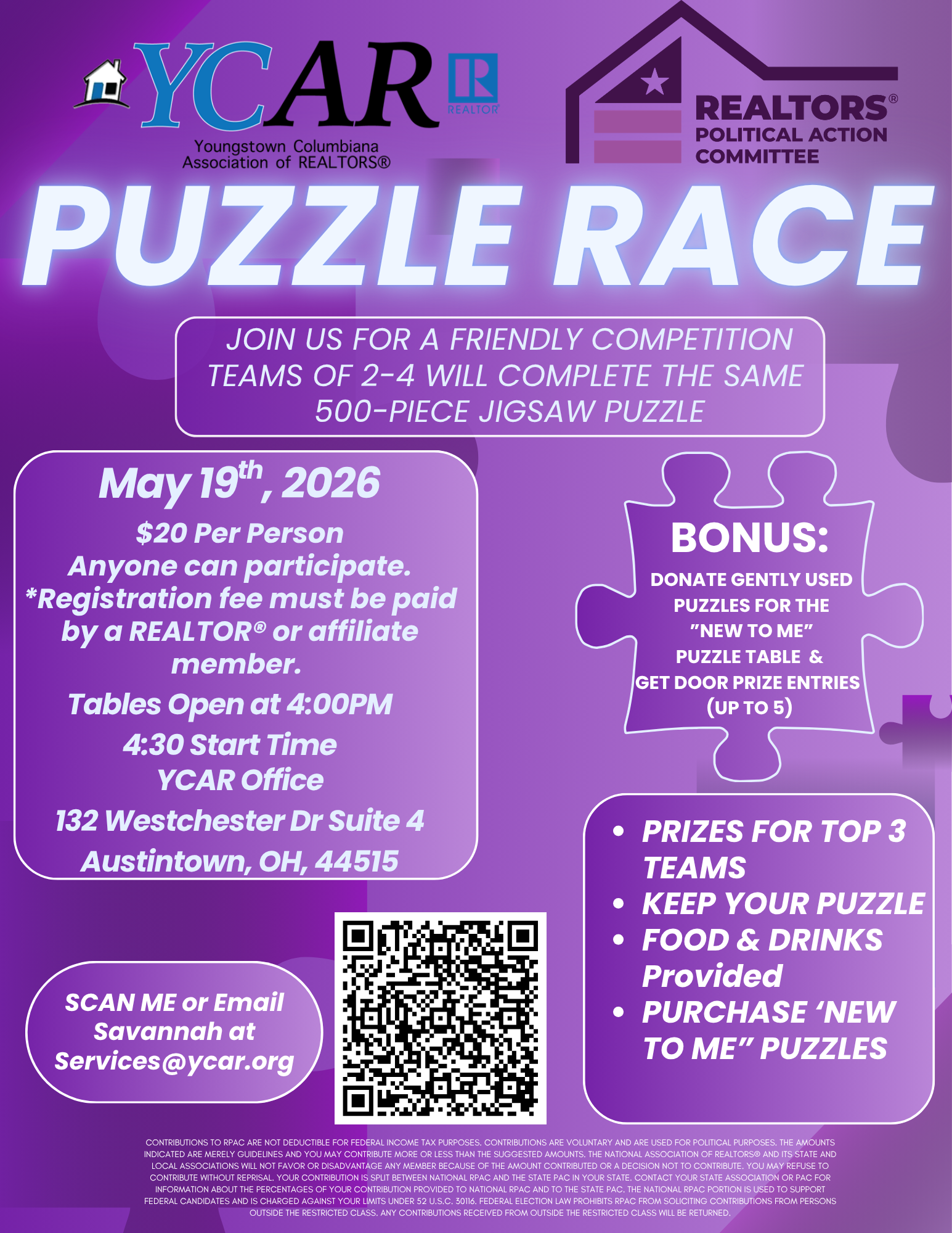 19 May 2026 RPAC Puzzle Race 2026 RPAC Puzzle Race Tuesday, May 19, 2026 (4:00 PM to 7:00 PM) YCAR Office Details You're Registered! DescriptionLocation Join RPAC at the YCAR Office for our Puzzle Race! To register your team on RAMCO, choose the option "I would like to register myself and others." under meeting registration options. Then enter each name. You can also fill out the flyer below and return it to Savannah at services@ycar.org. YCAR Office 132 Westchester DrSuite 4Austintown, OH 44515 Map & Directions